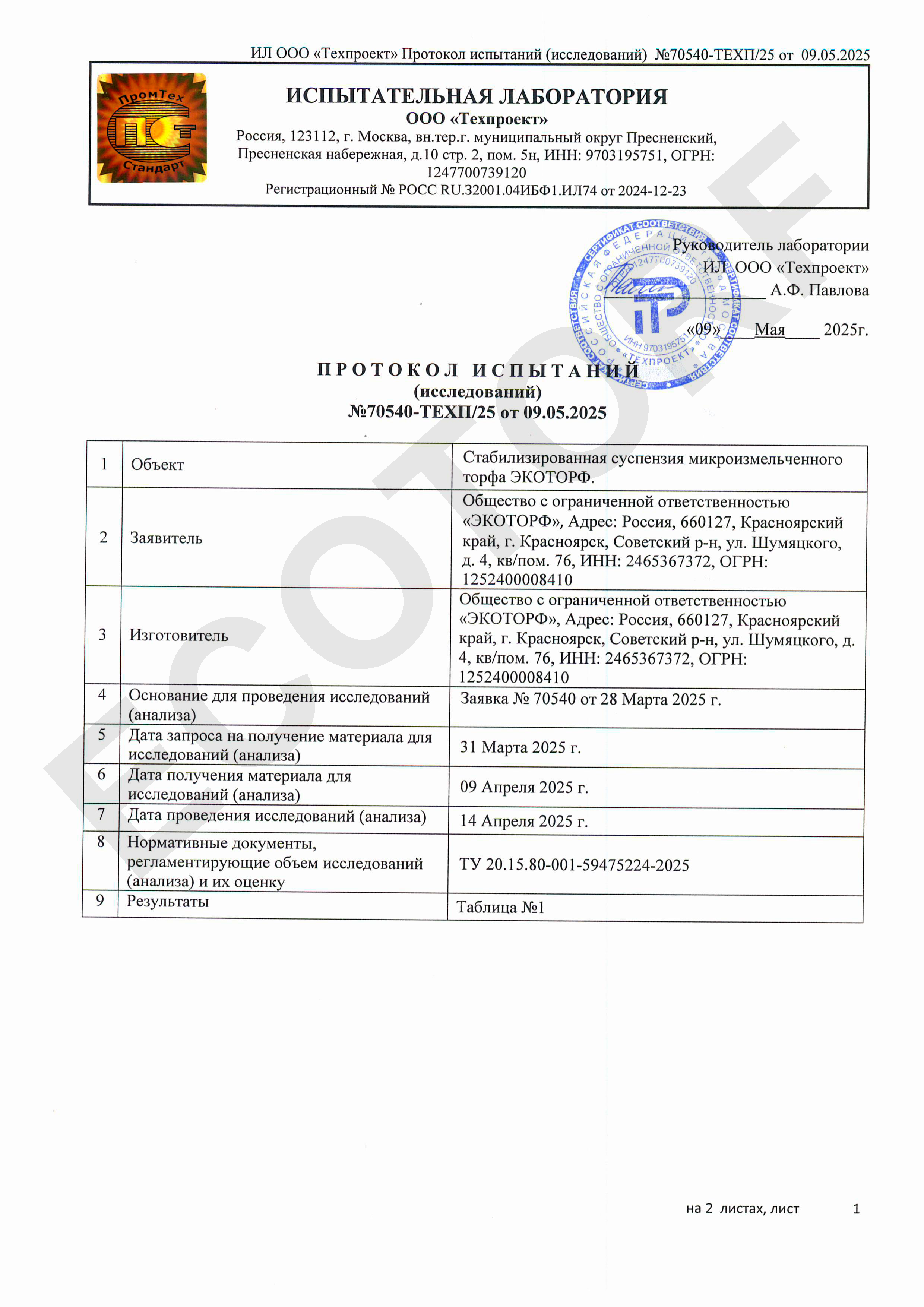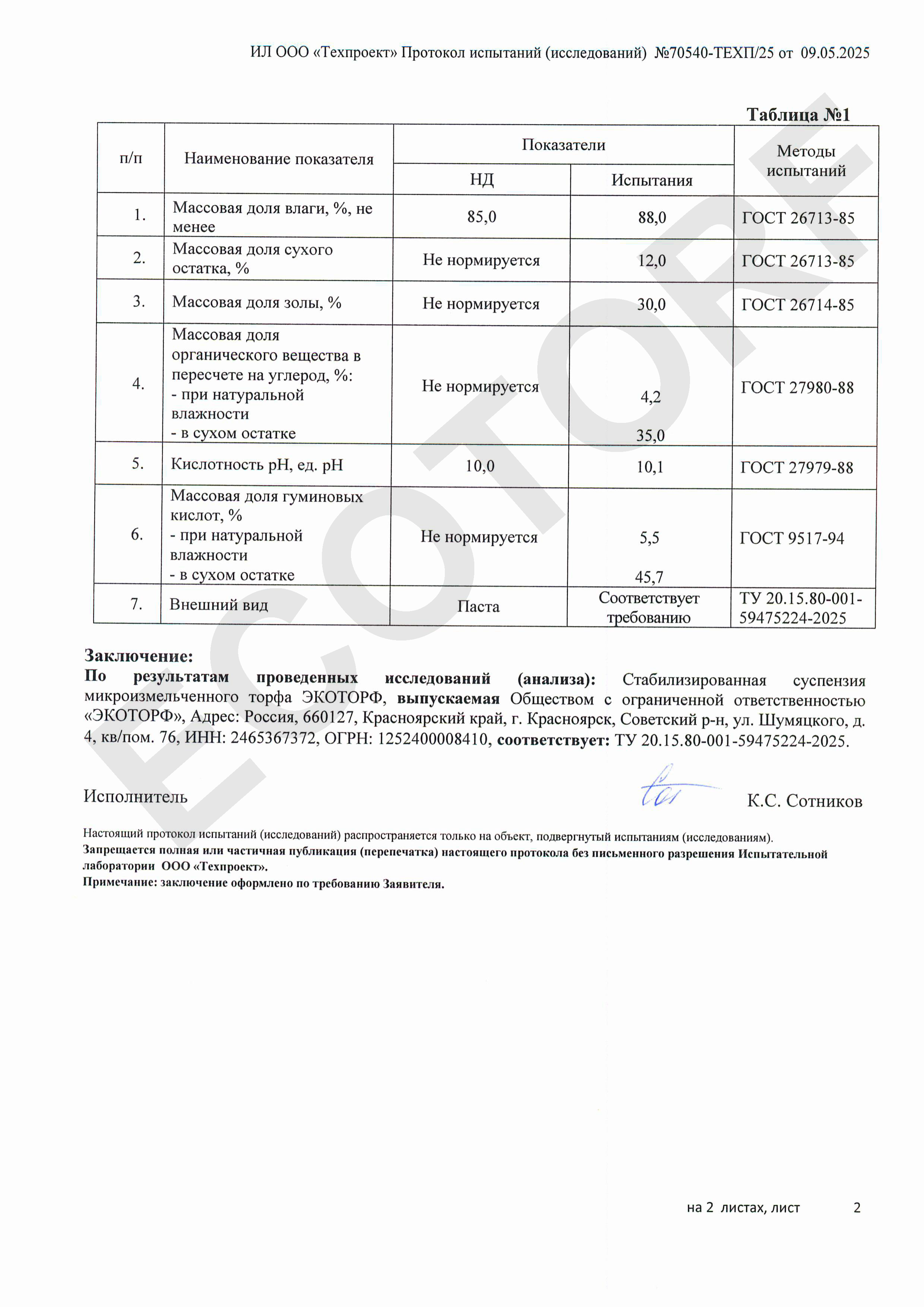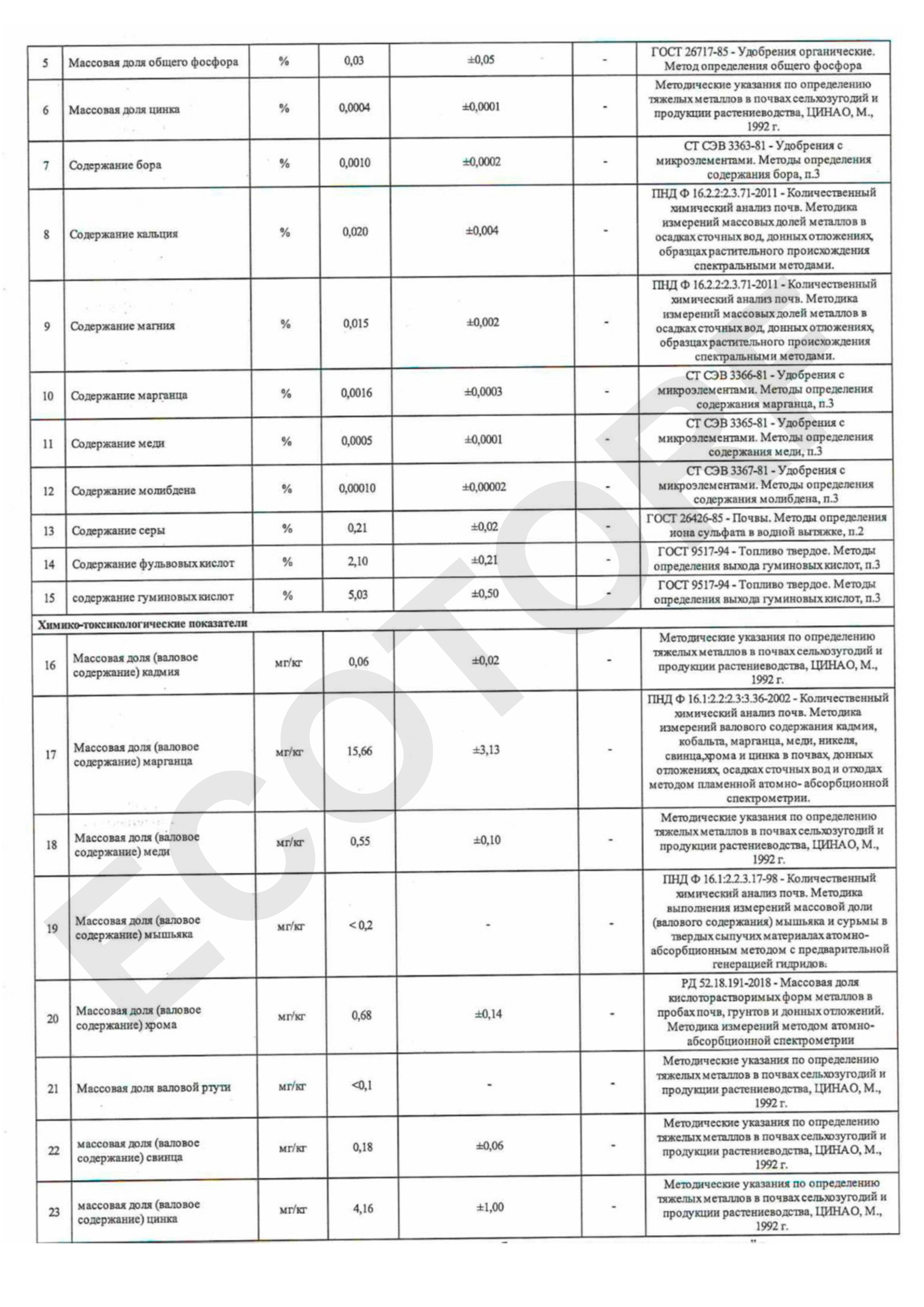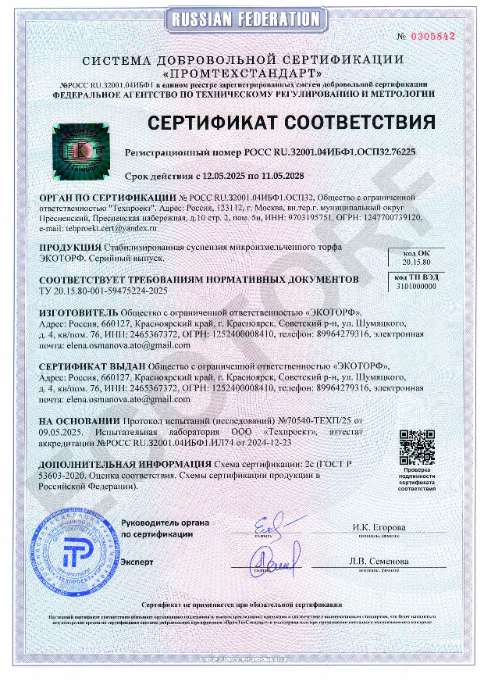 ECOTORF содержит высокий уровень гуминовых кислот, подтверждённый лабораторными исследованиями.